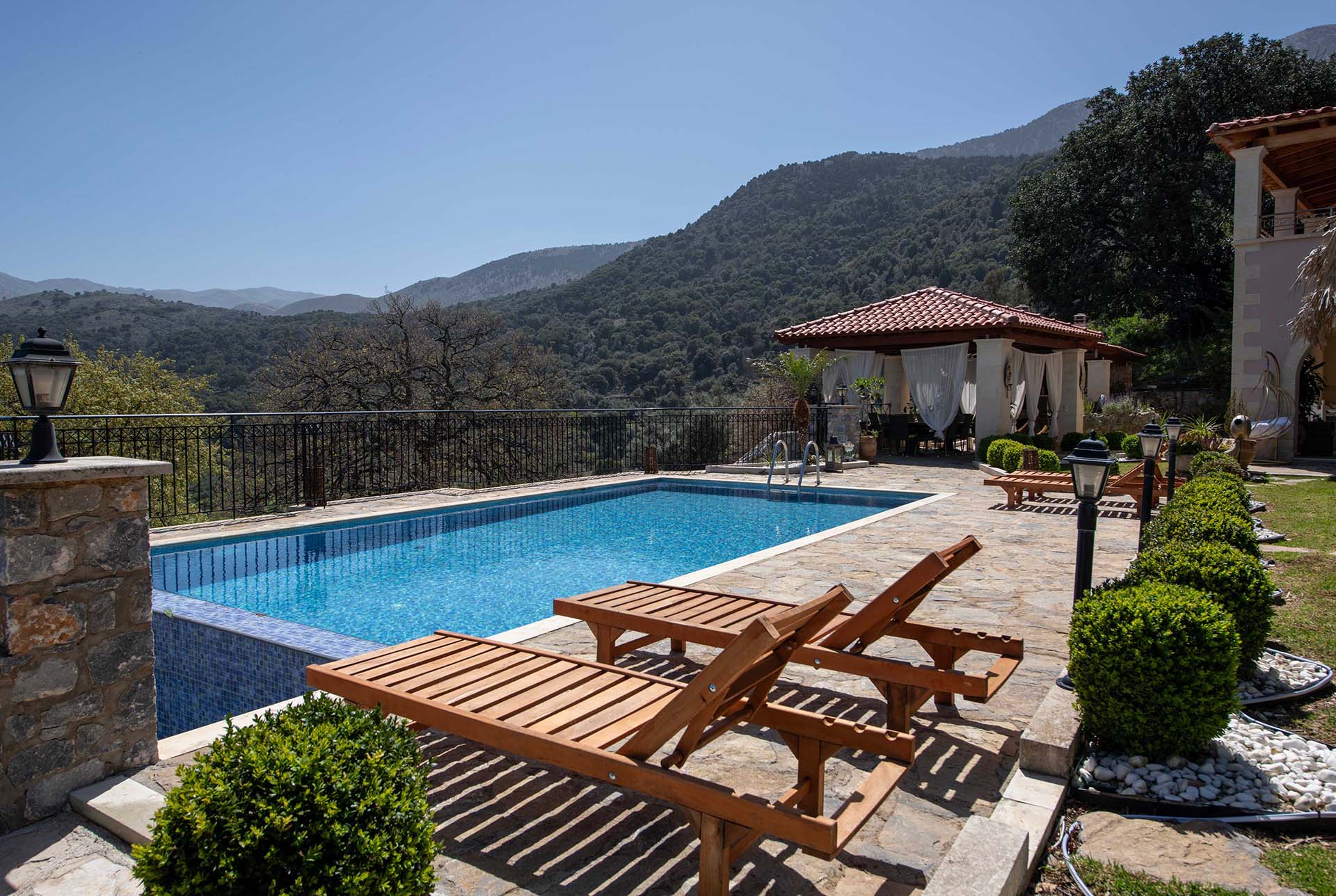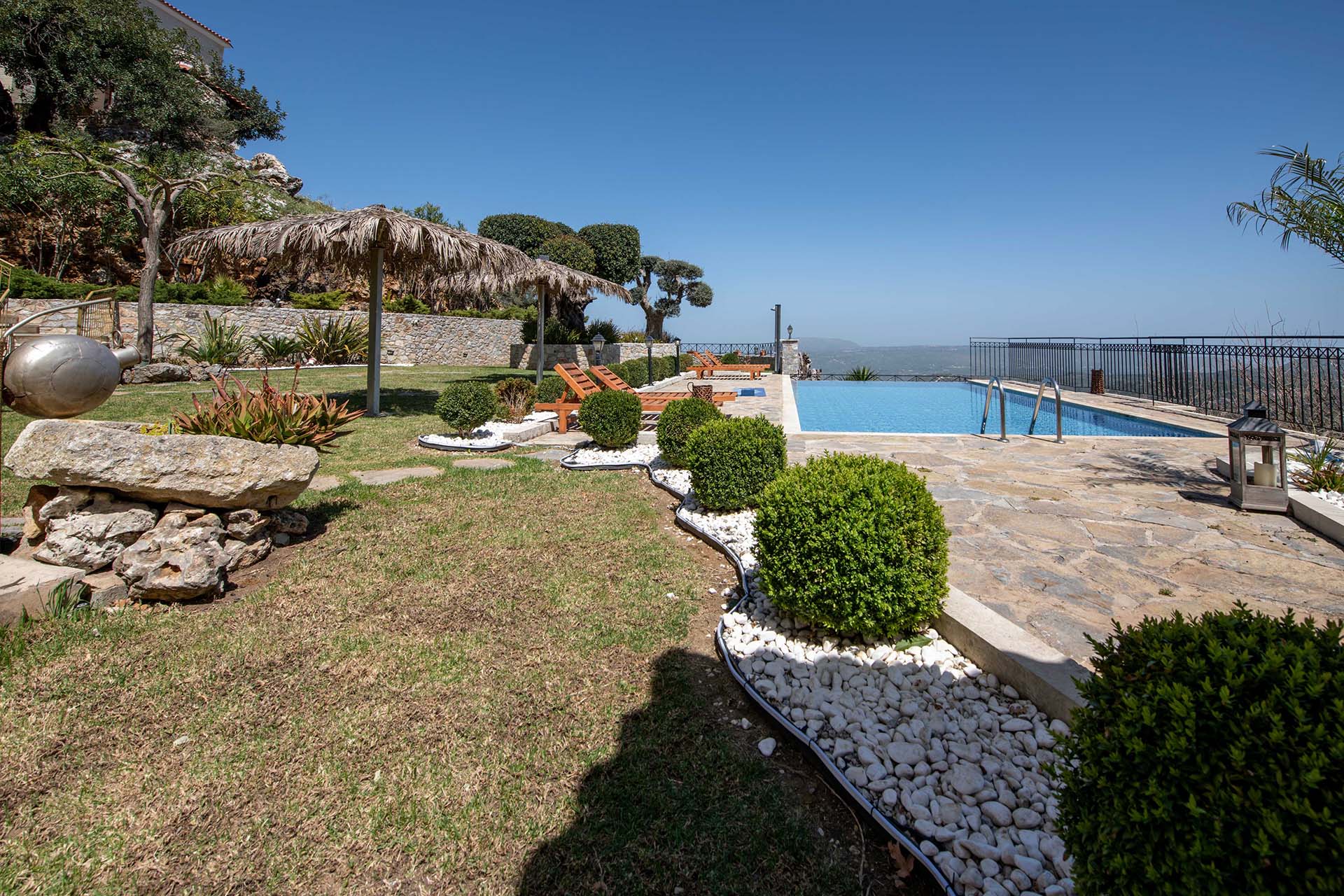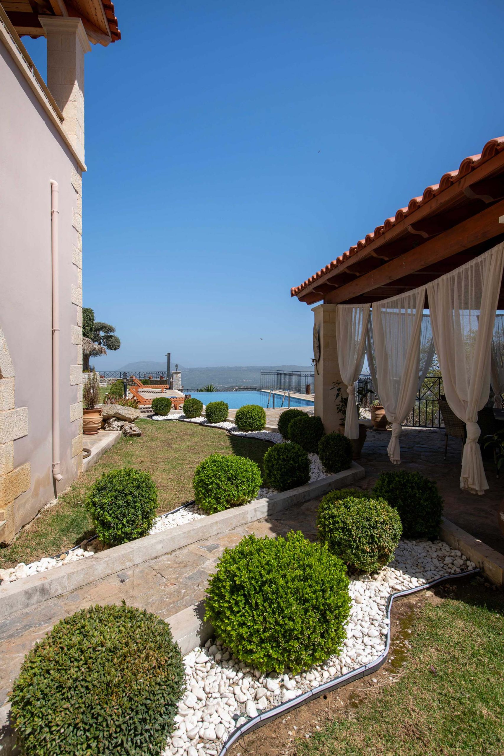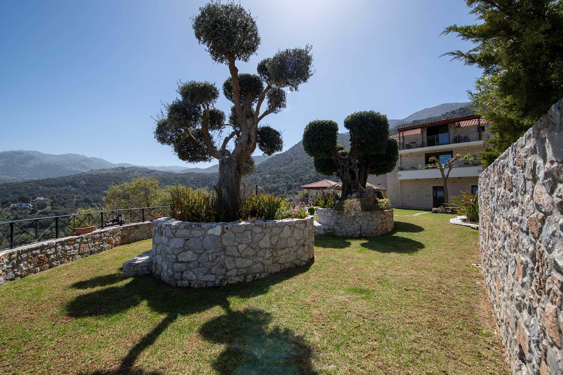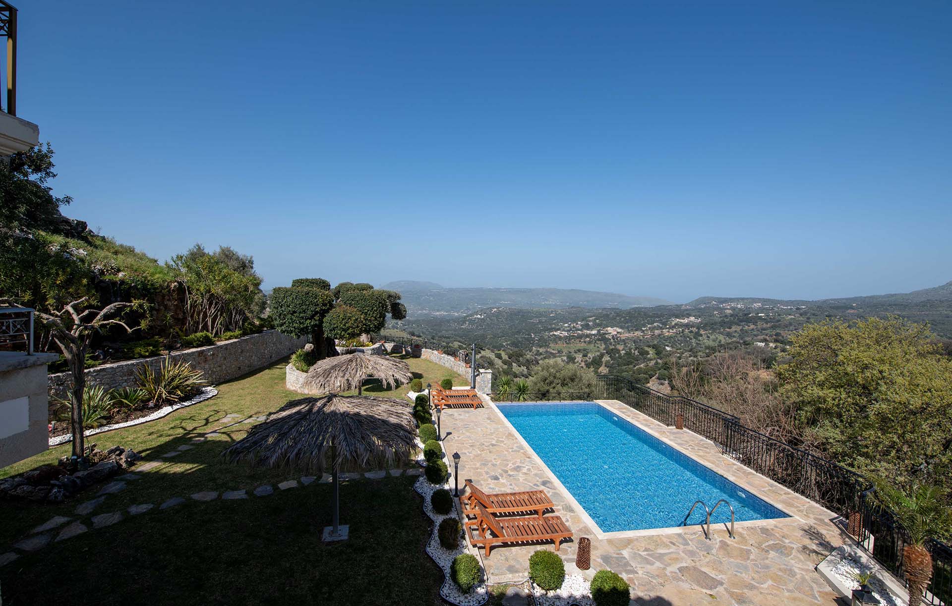 Geroulios Kastro – Superior Villa is located in the hills above Emprosneros, a quiet village in the Apokoronas region of Chania. The area is rural and surrounded by greenery, with very little through traffic and no nearby buildings.
