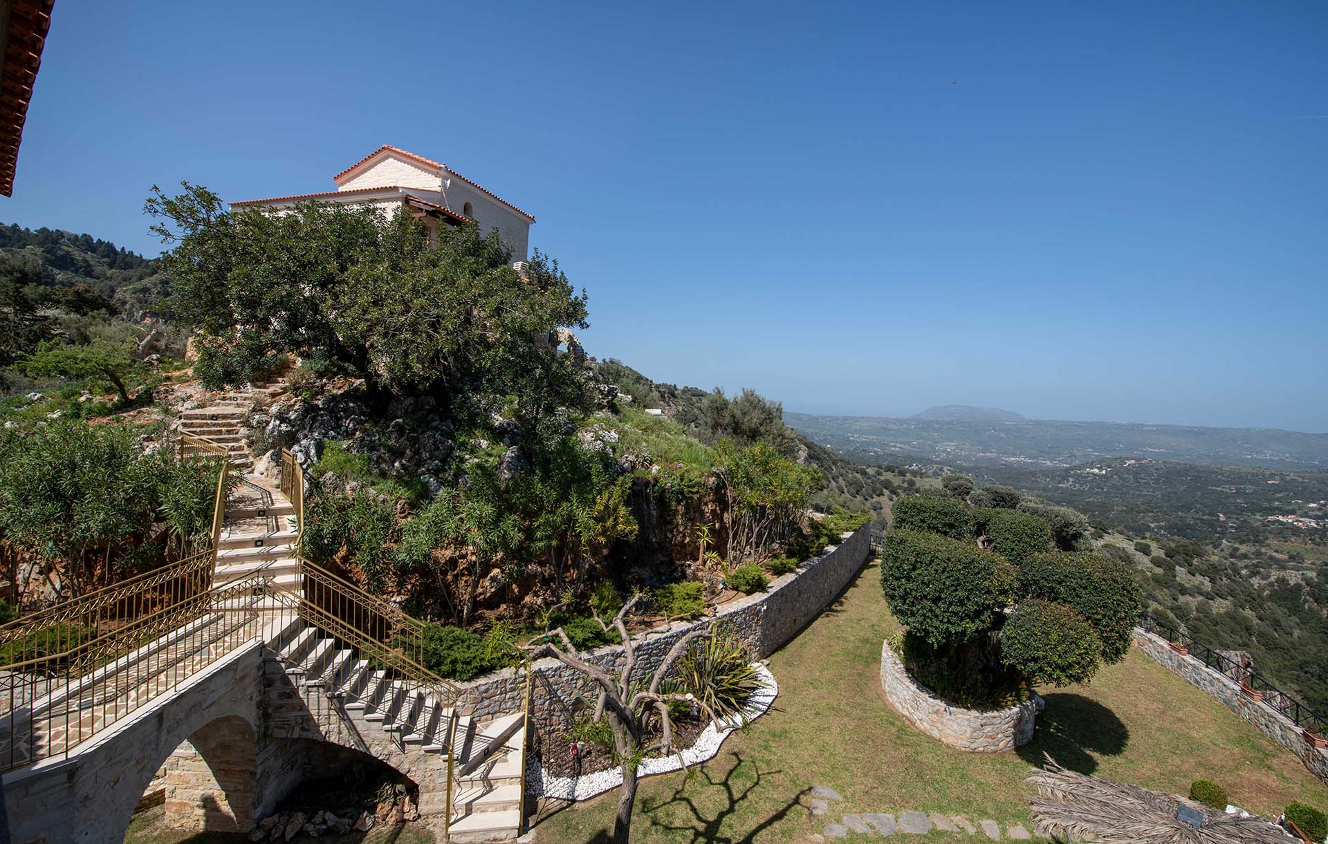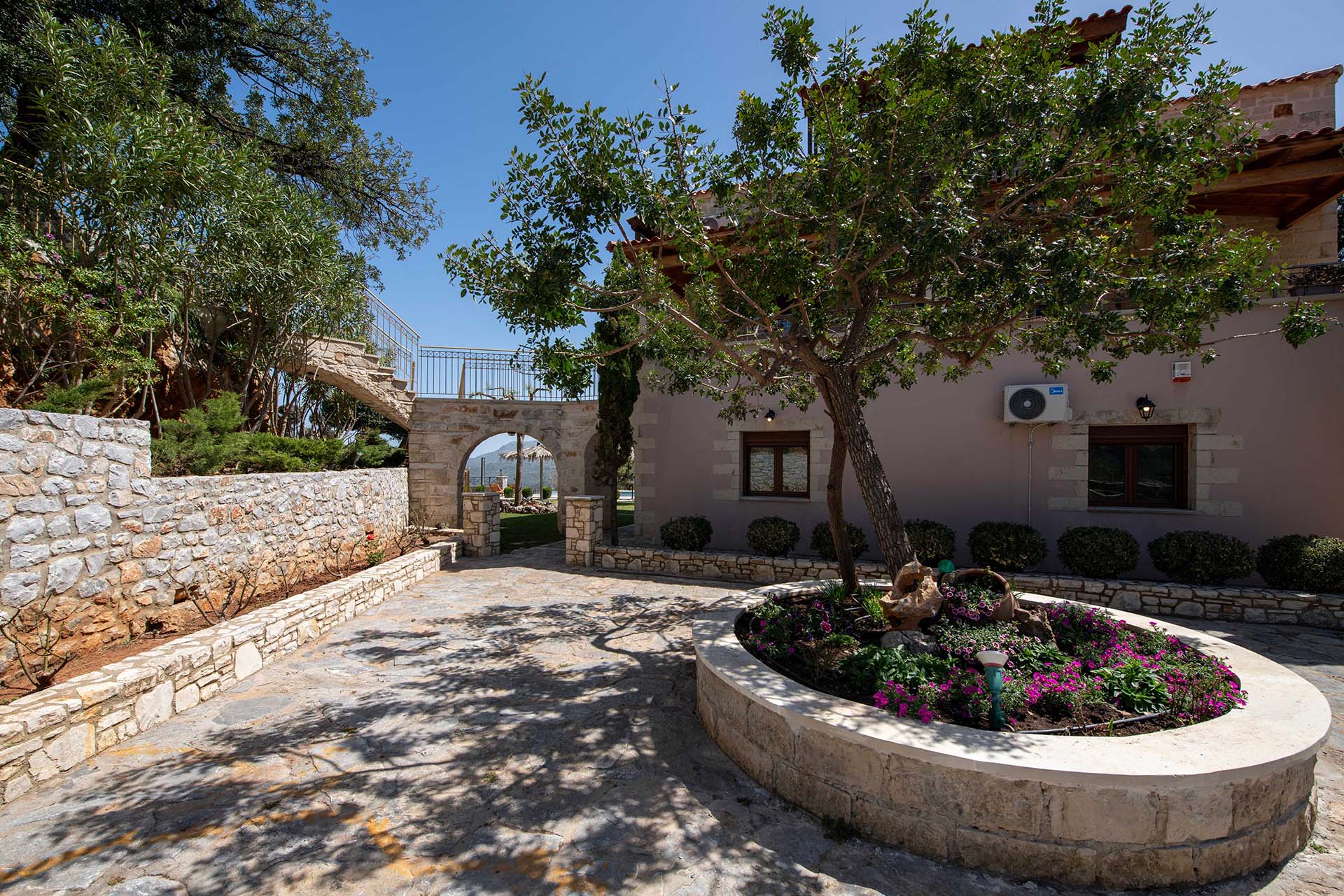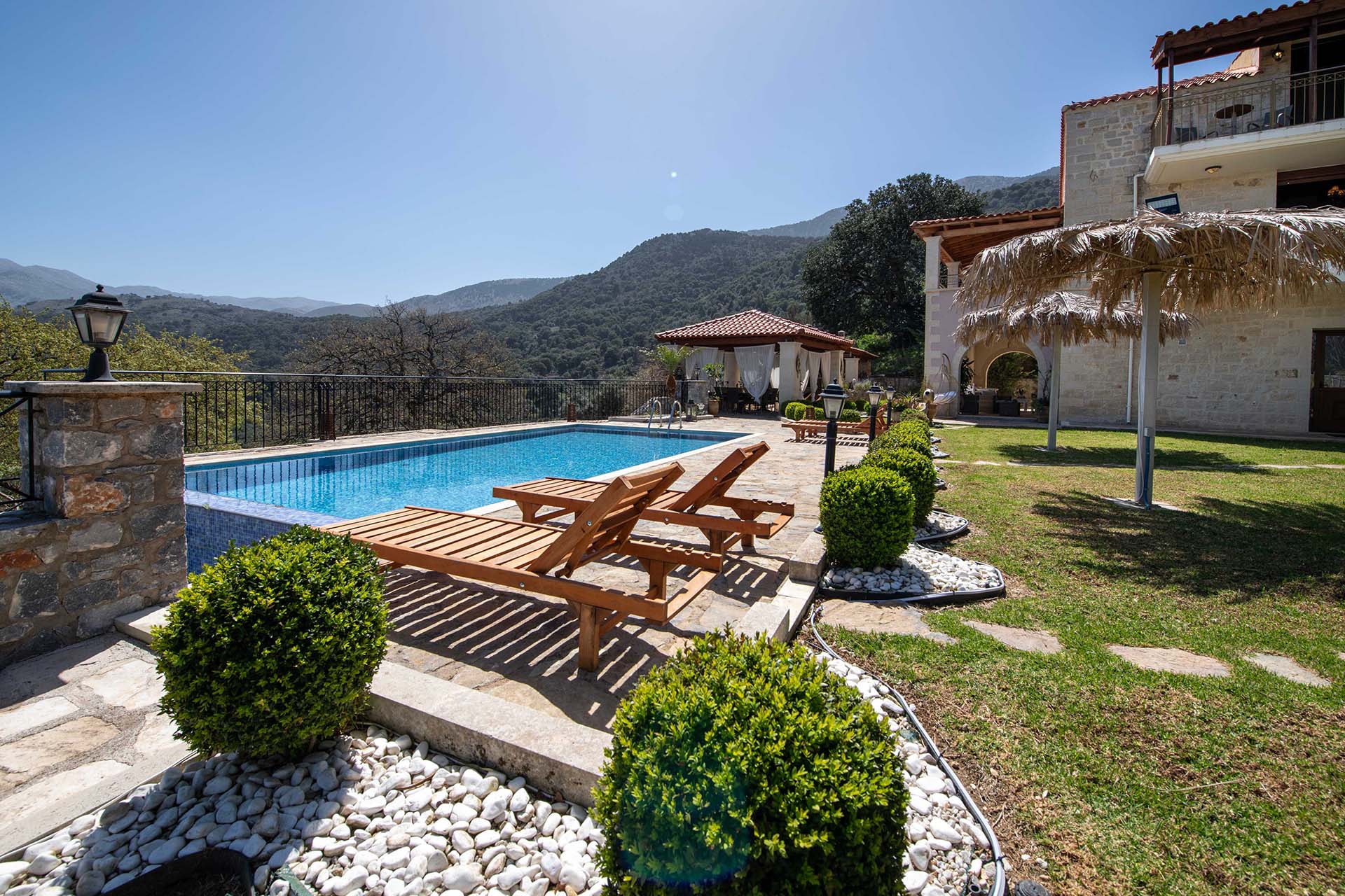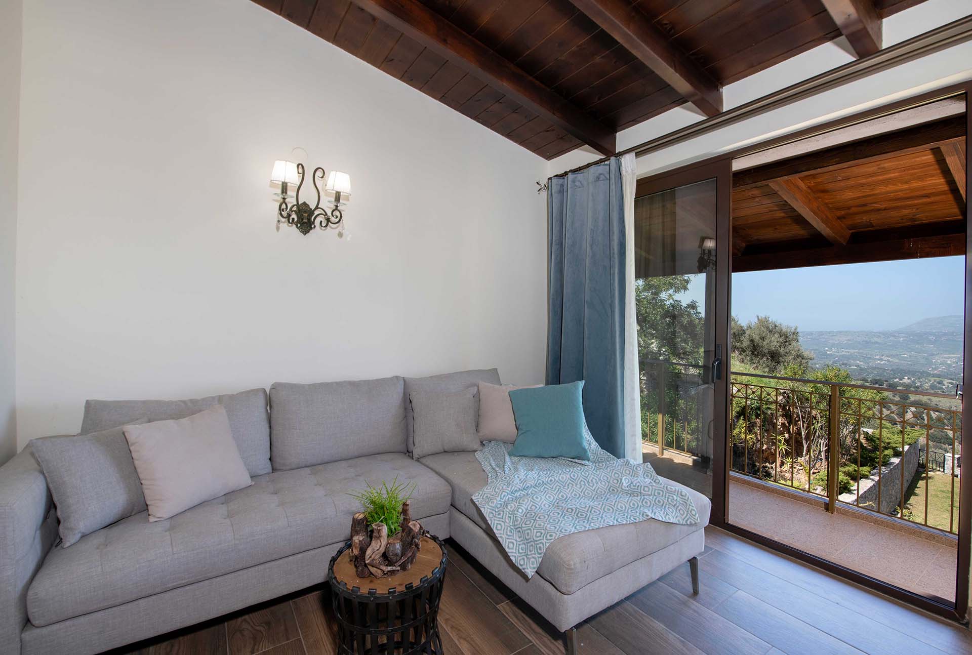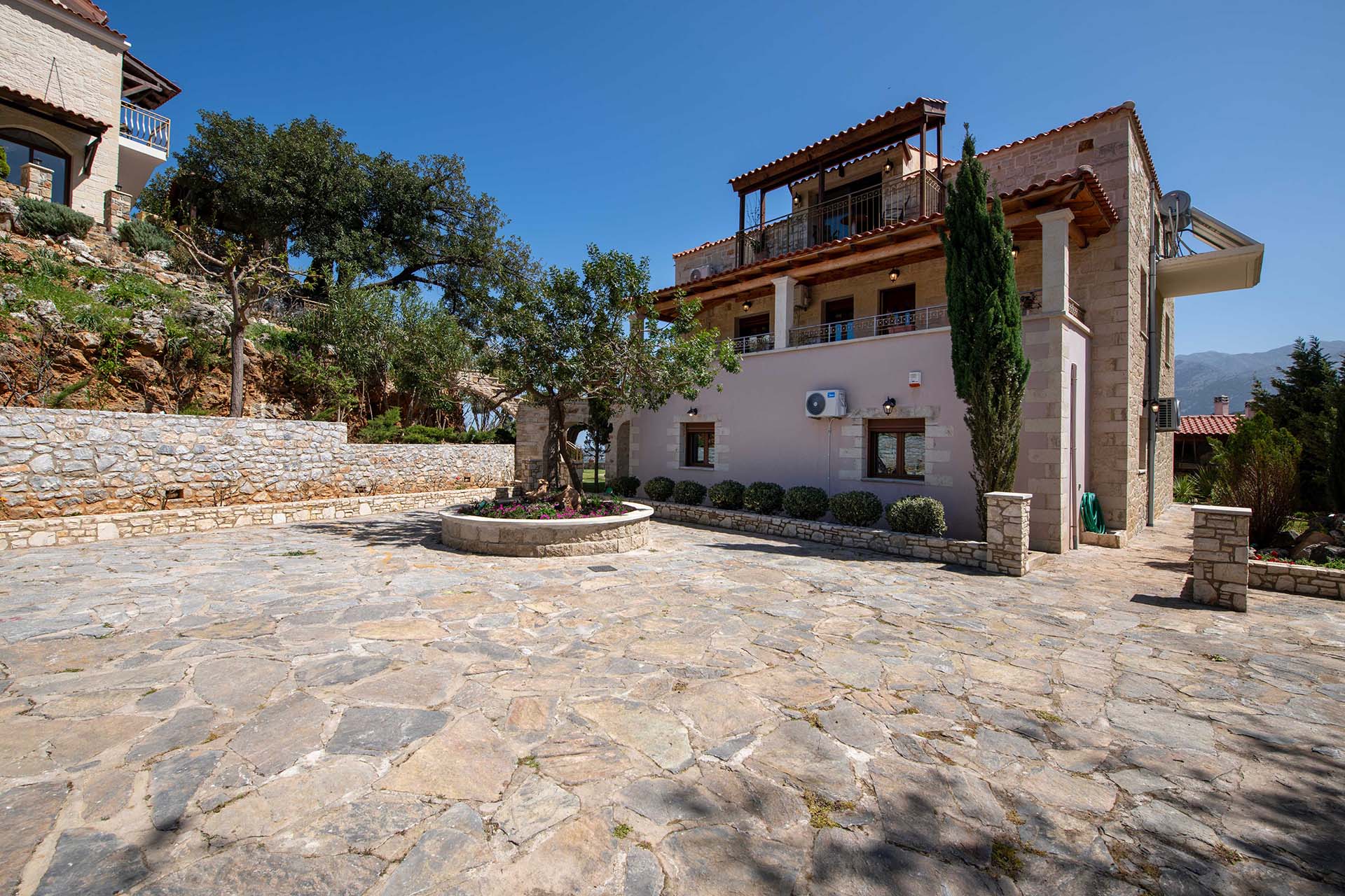Geroulios Kastro – Superior Villa is located in the hills above Emprosneros, a quiet village in the Apokoronas region of Chania. The area is rural and surrounded by greenery, with very little through traffic and no nearby buildings.