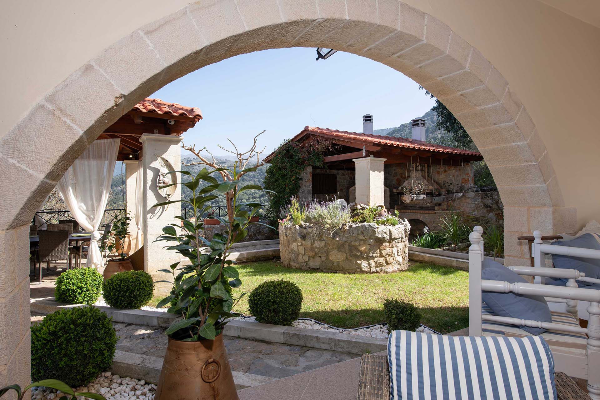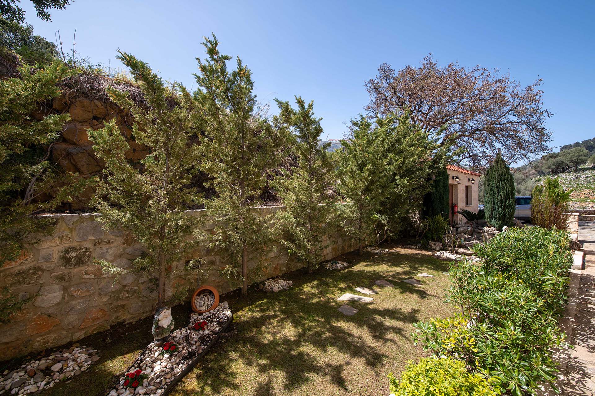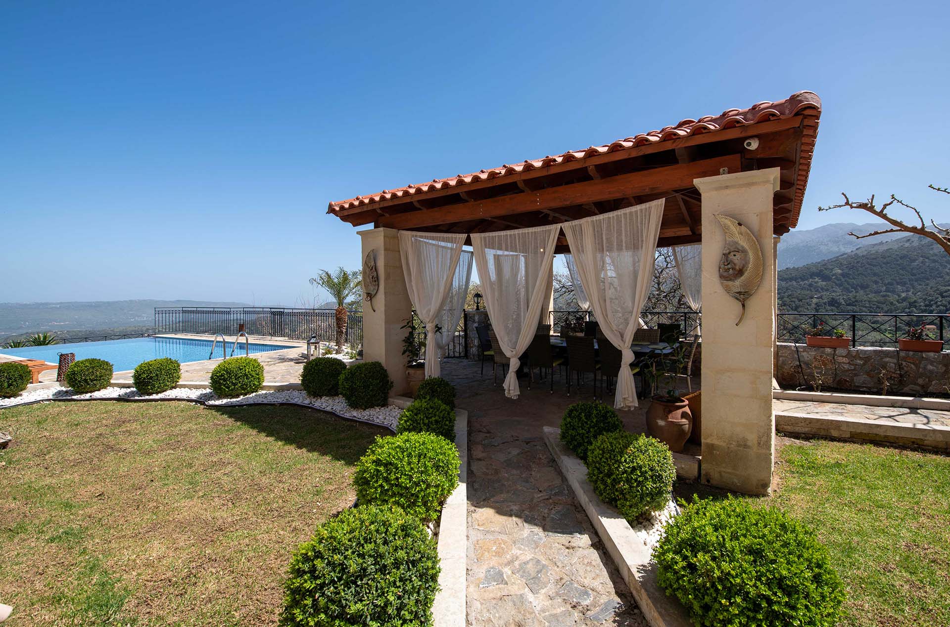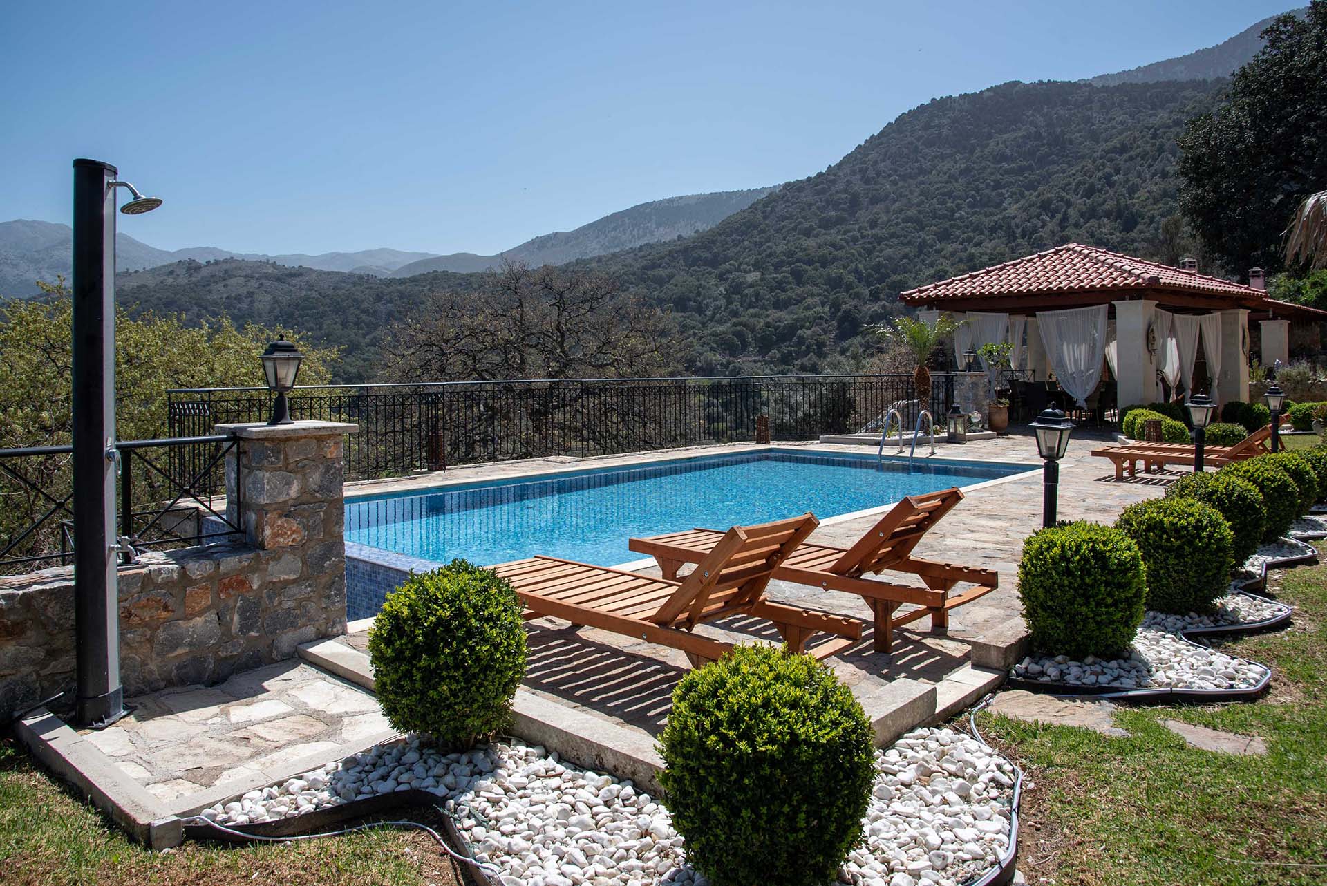 Geroulios Kastro – Superior Villa is located in the hills above Emprosneros, a quiet village in the Apokoronas region of Chania. The area is rural and surrounded by greenery, with very little through traffic and no nearby buildings.