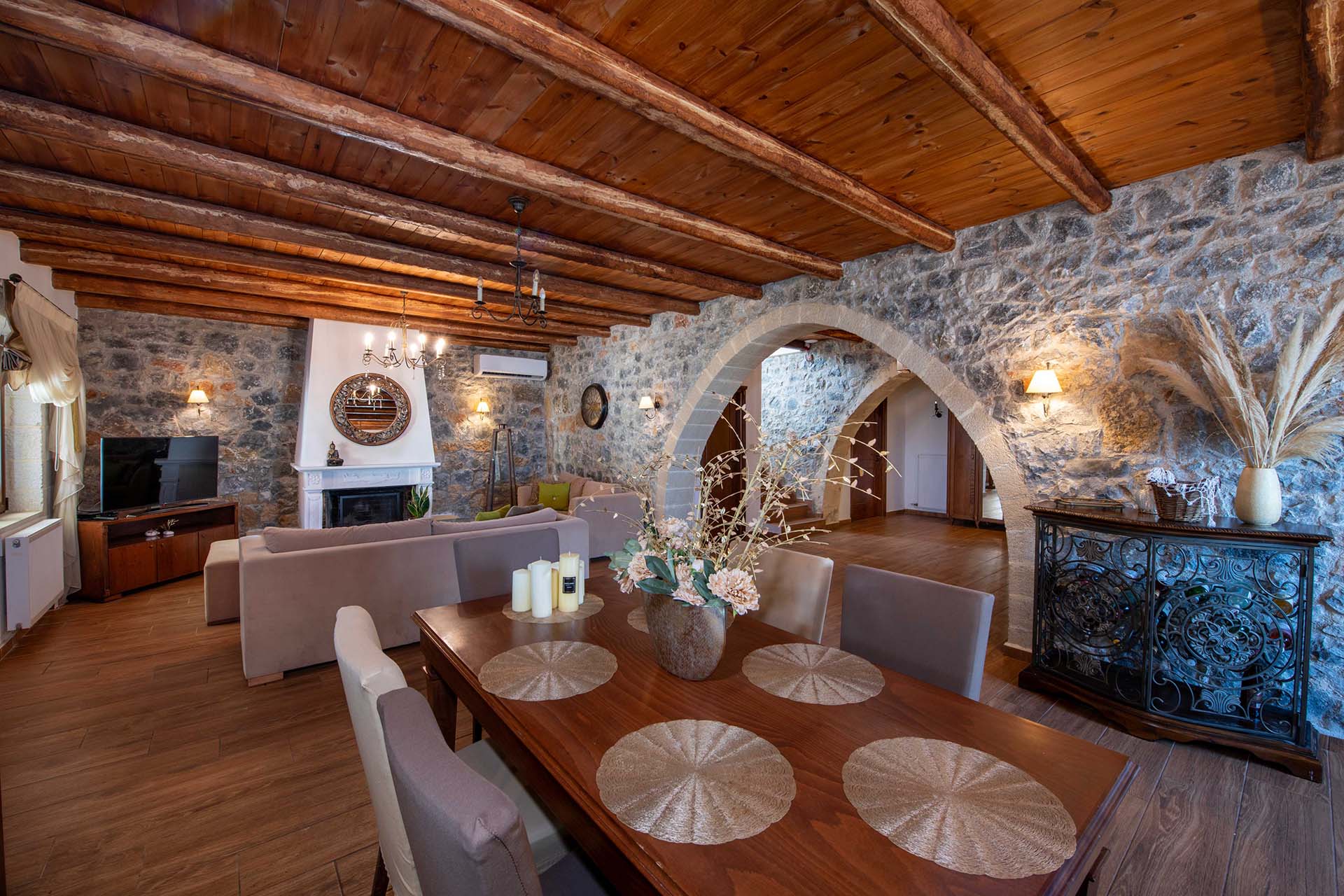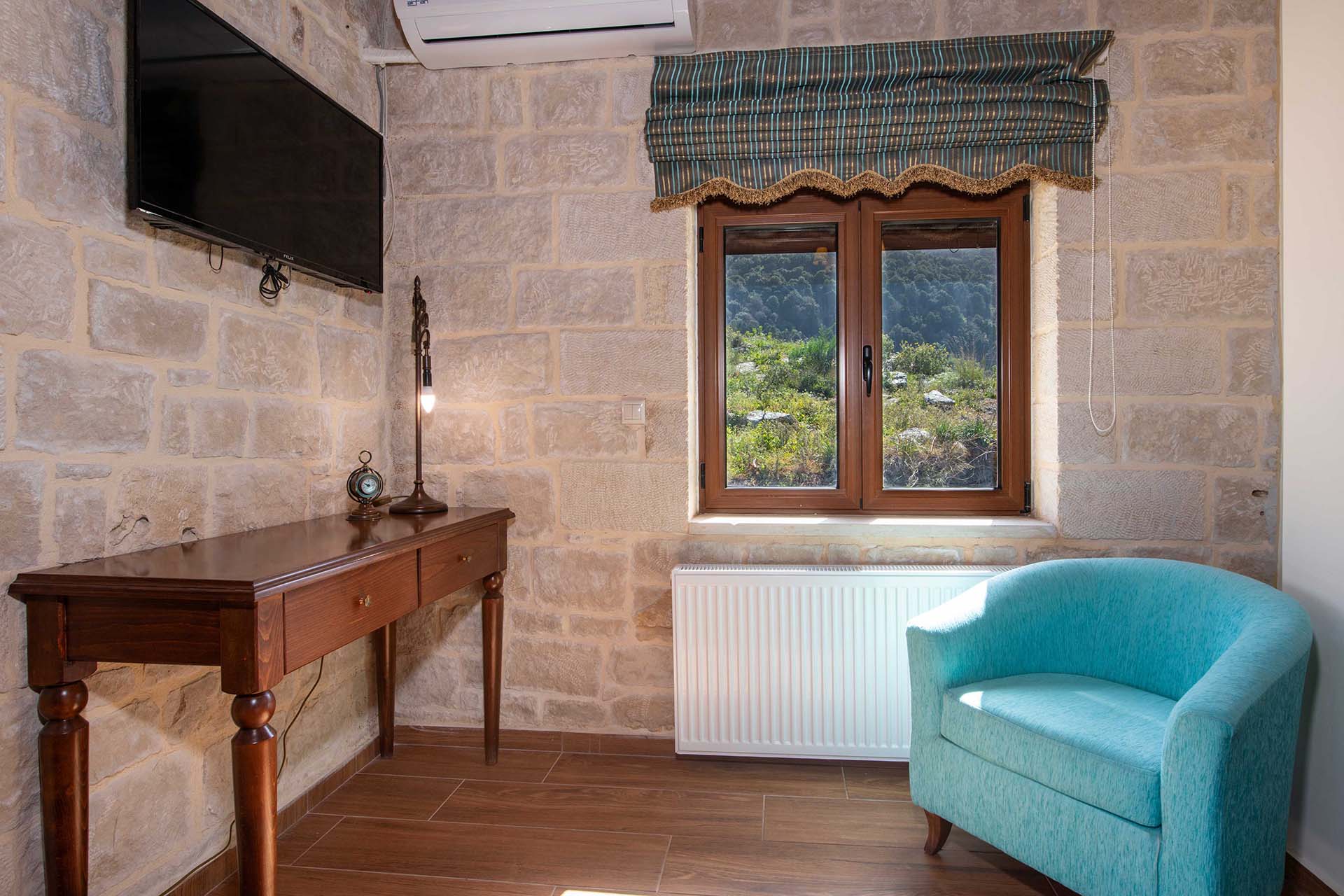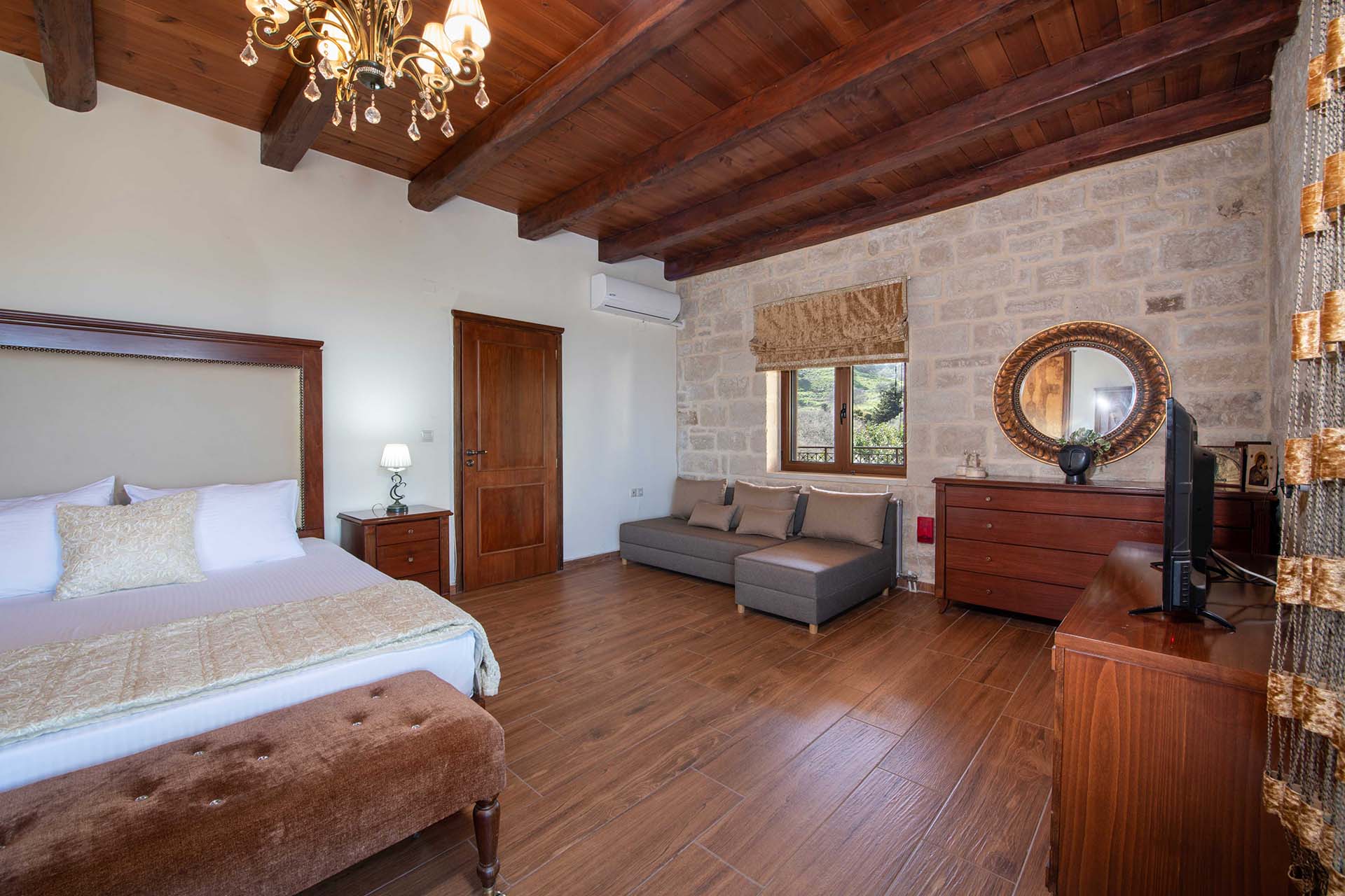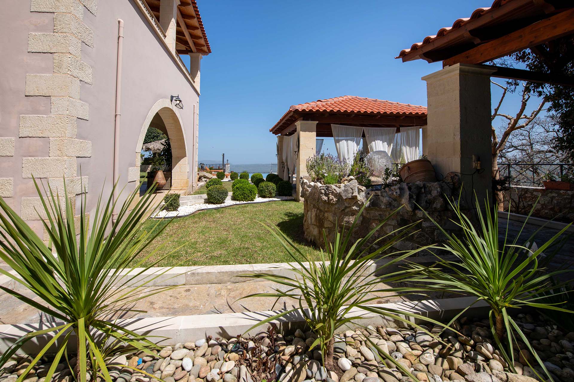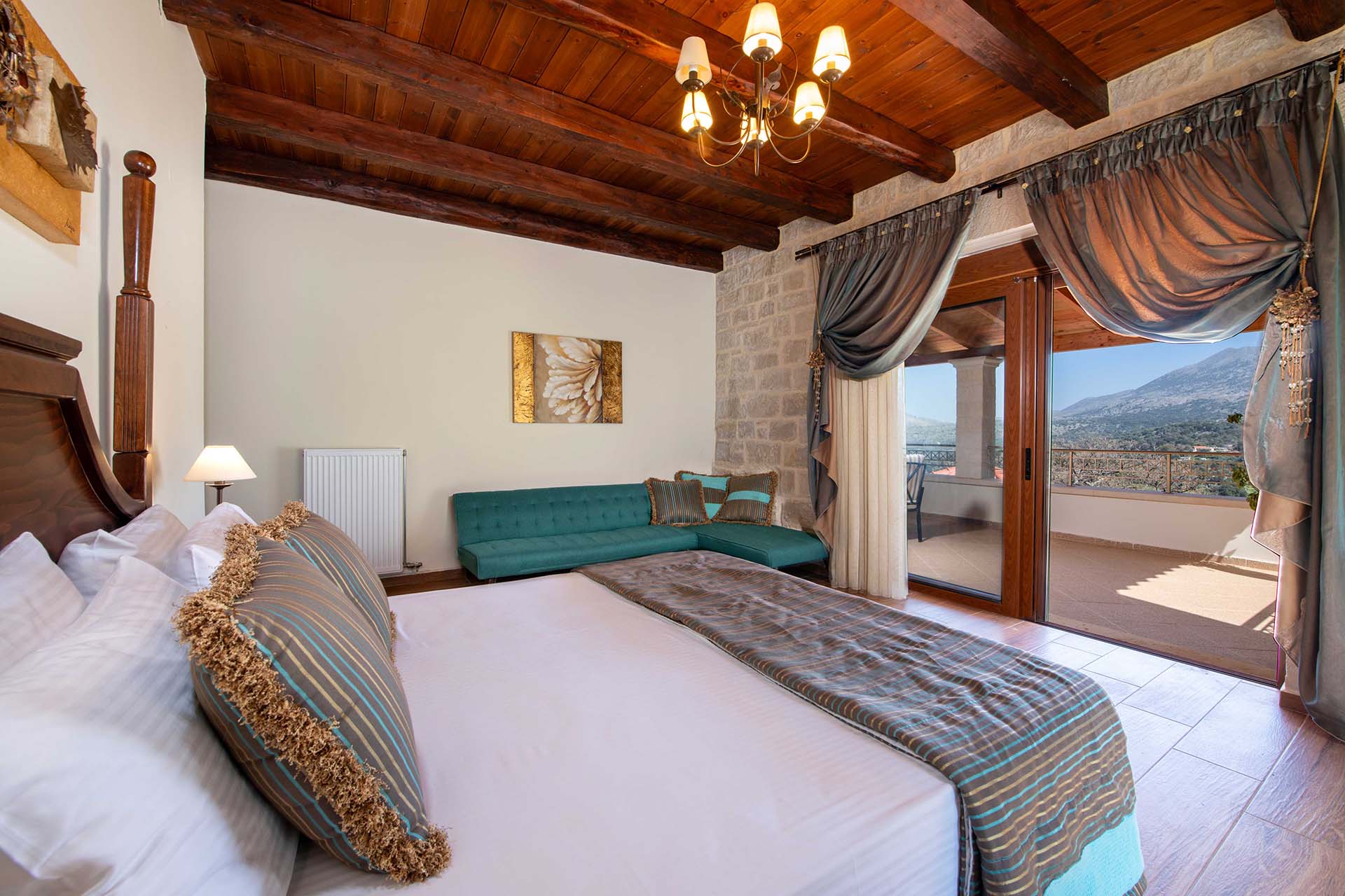 Geroulios Kastro – Superior Villa is located in the hills above Emprosneros, a quiet village in the Apokoronas region of Chania. The area is rural and surrounded by greenery, with very little through traffic and no nearby buildings.