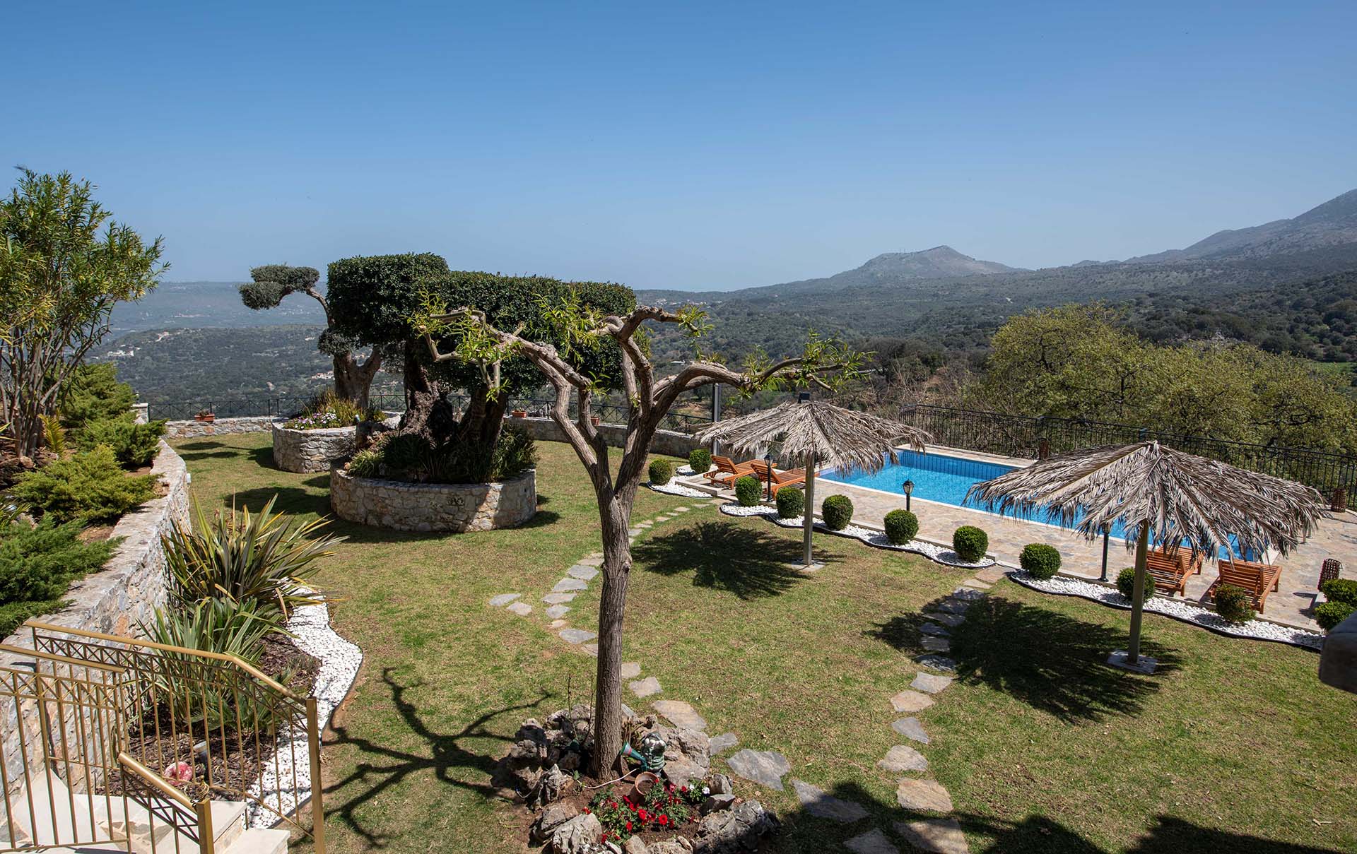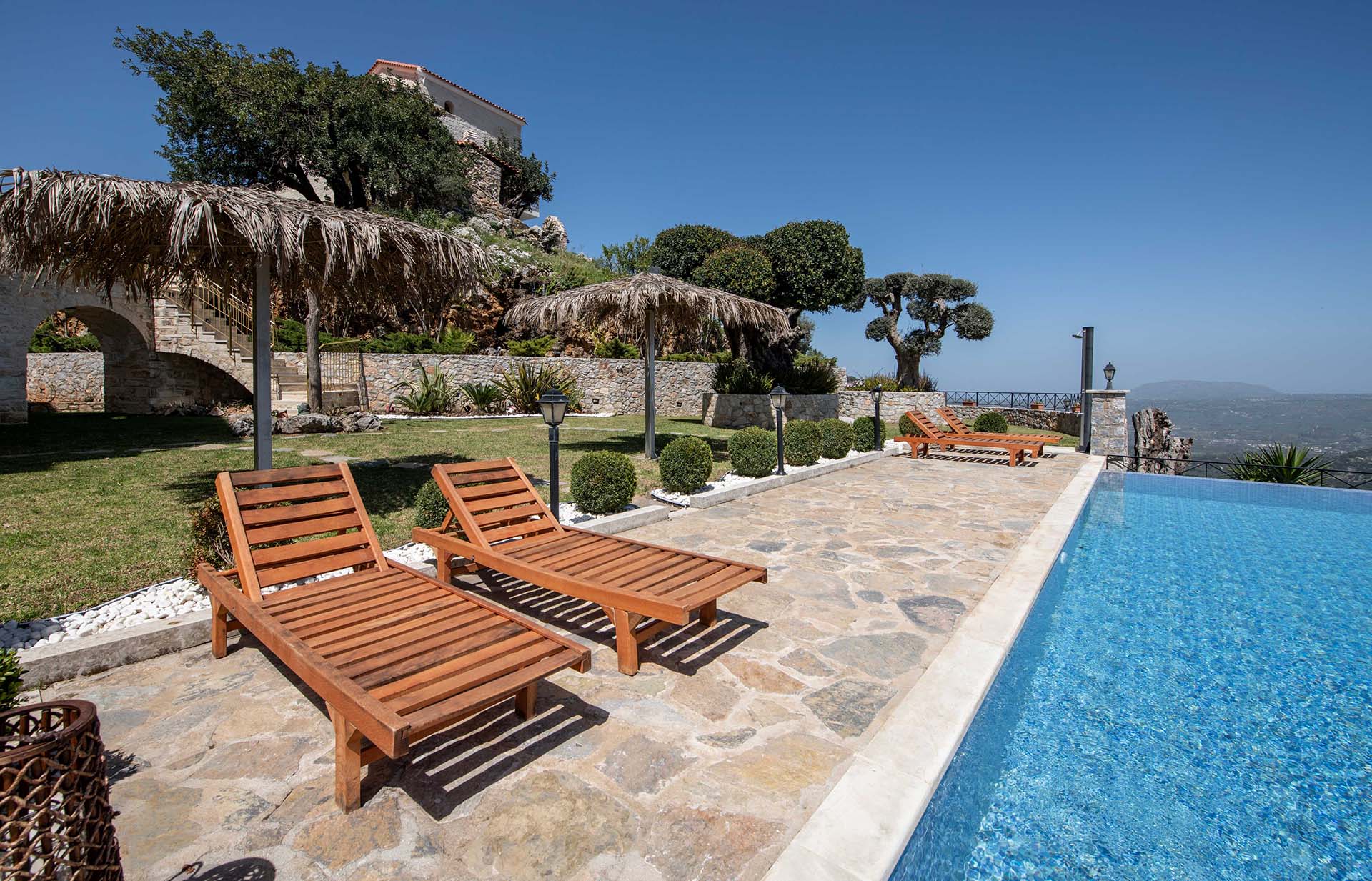 Geroulios Kastro Villa I is a high-comfort residence set on elevated ground above the village of Emprosneros, in the Apokoronas region of Chania, Crete. Surrounded by trees and open landscape, the villa is completely secluded, with no neighboring properties and direct access via a private road.