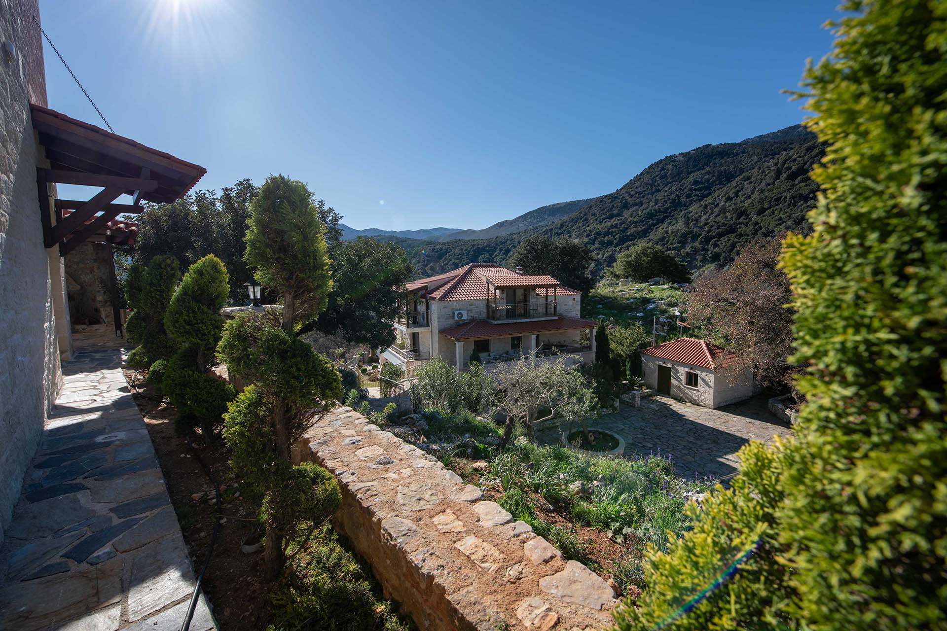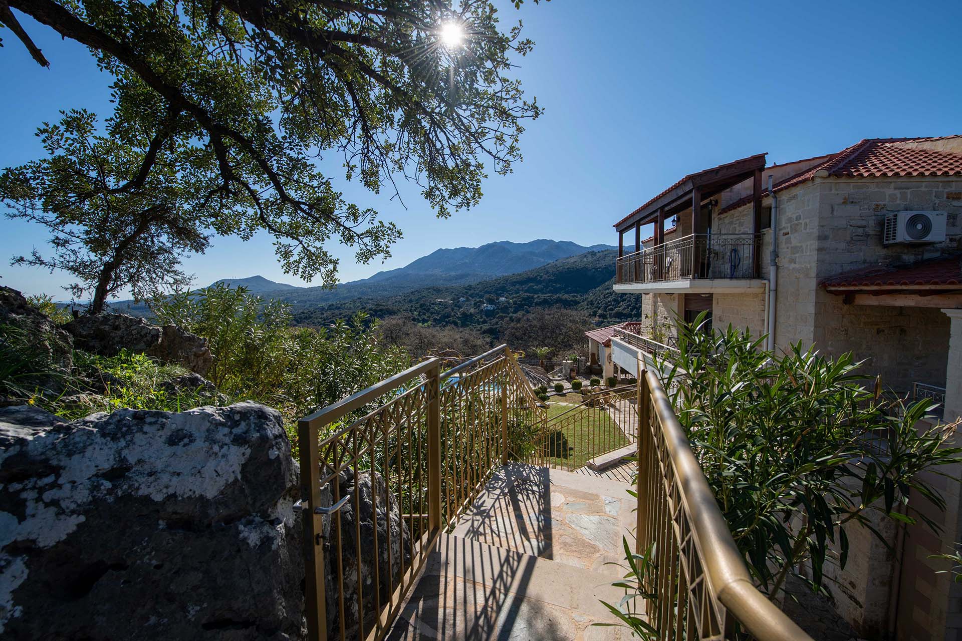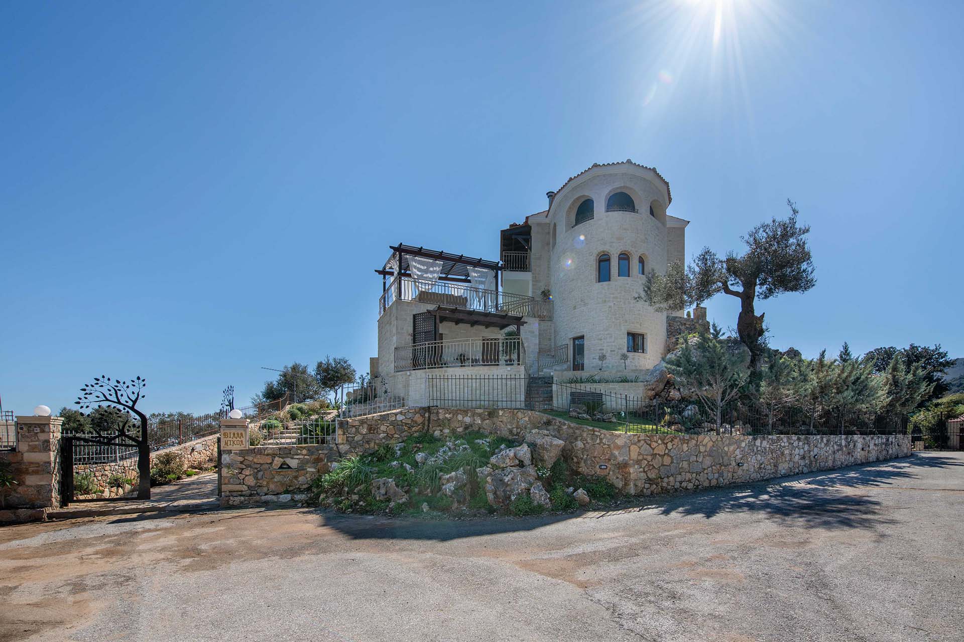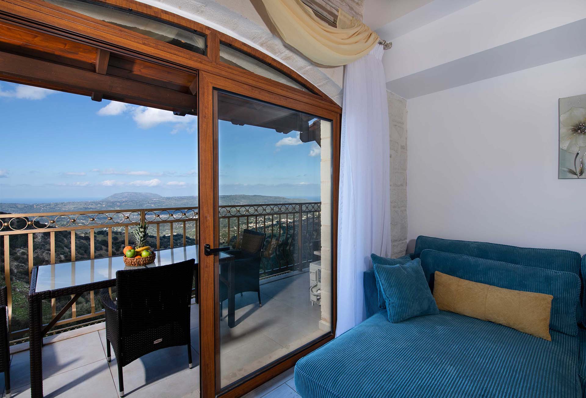 Geroulios Kastro – Deluxe Villa is located in the hills above Emprosneros, a quiet village in the Apokoronas region of Chania. The area is rural and surrounded by greenery, with very little through traffic and no nearby buildings.