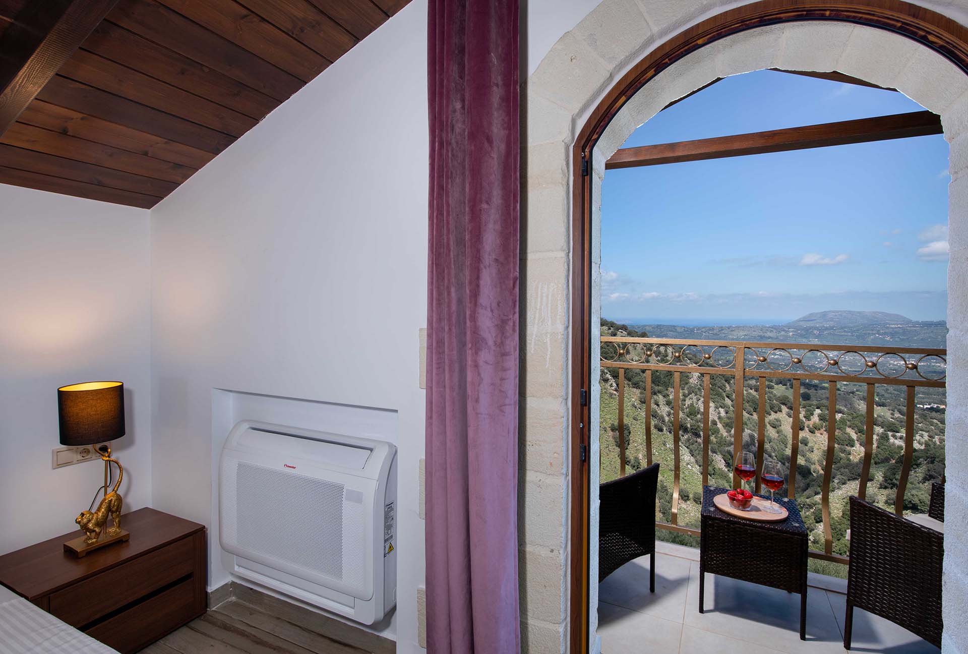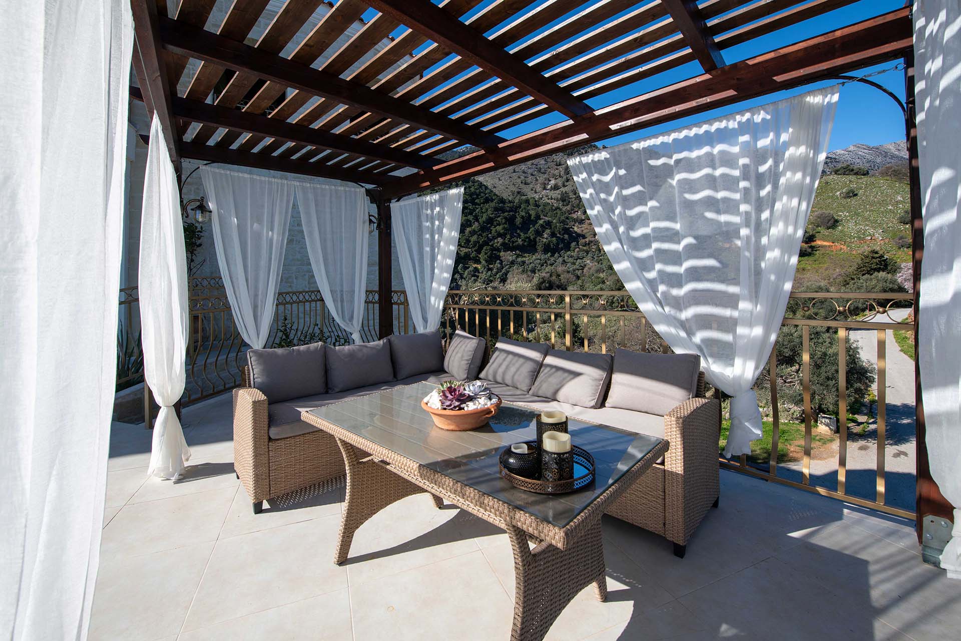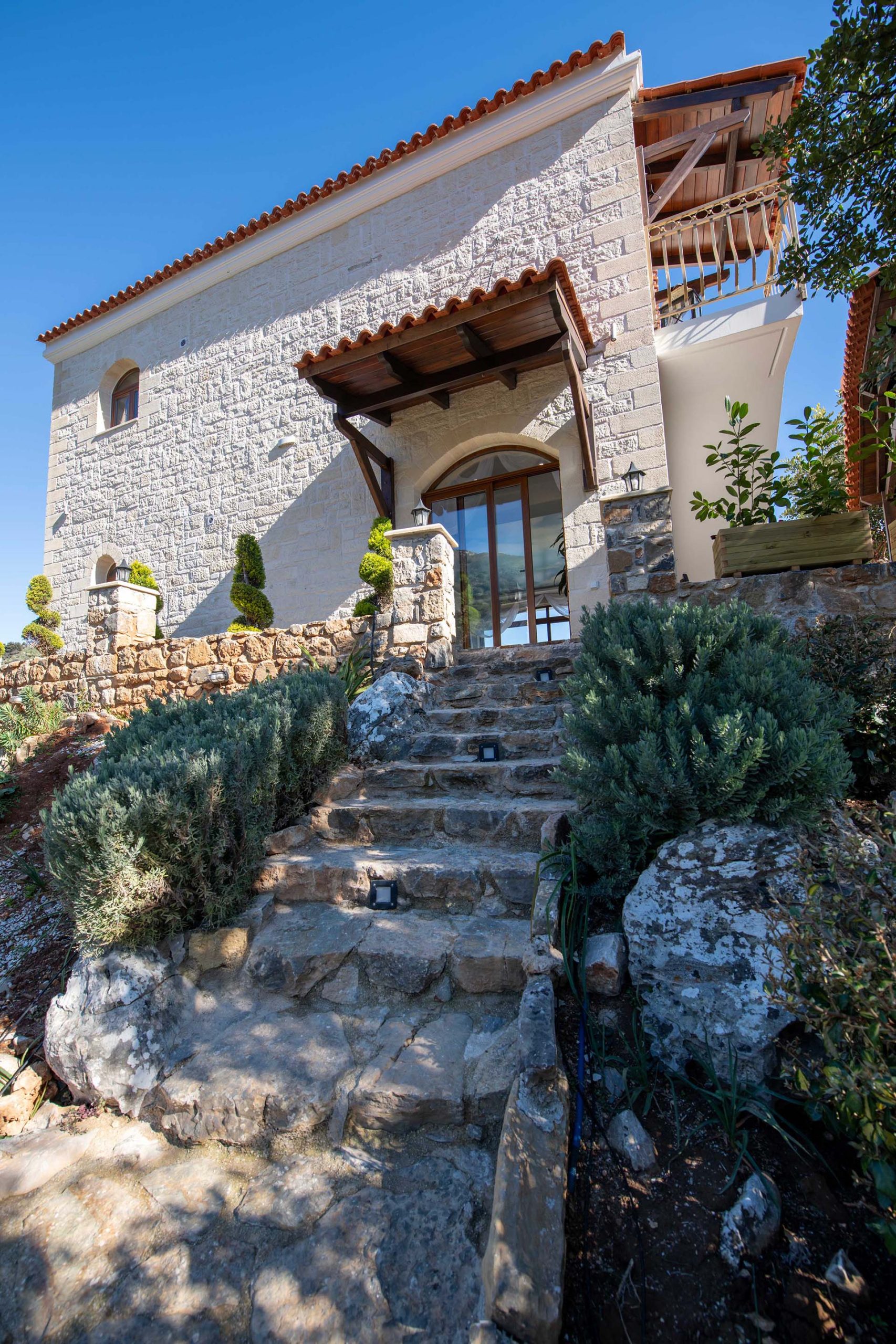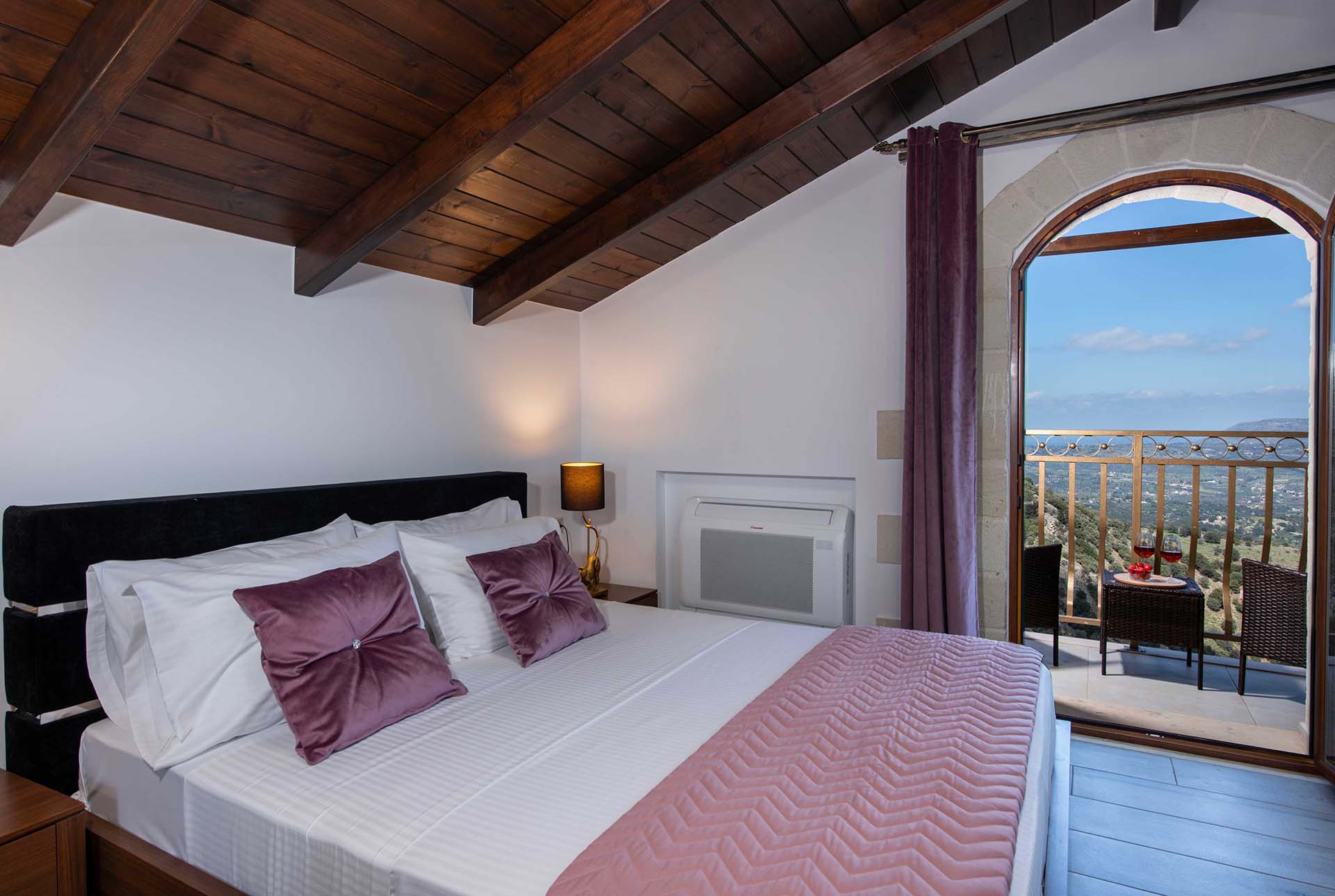 Geroulios Kastro – Deluxe Villa is located in the hills above Emprosneros, a quiet village in the Apokoronas region of Chania. The area is rural and surrounded by greenery, with very little through traffic and no nearby buildings.