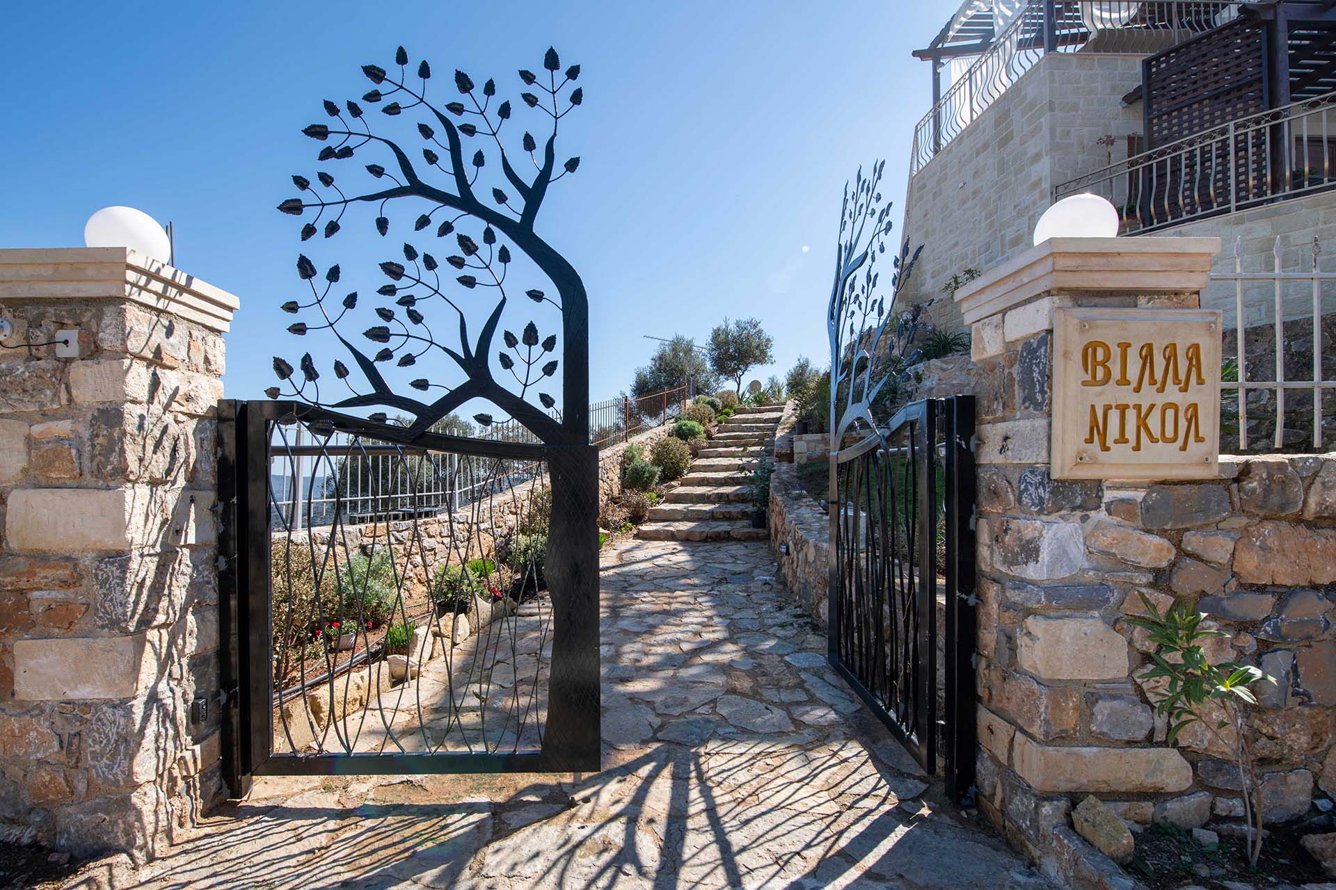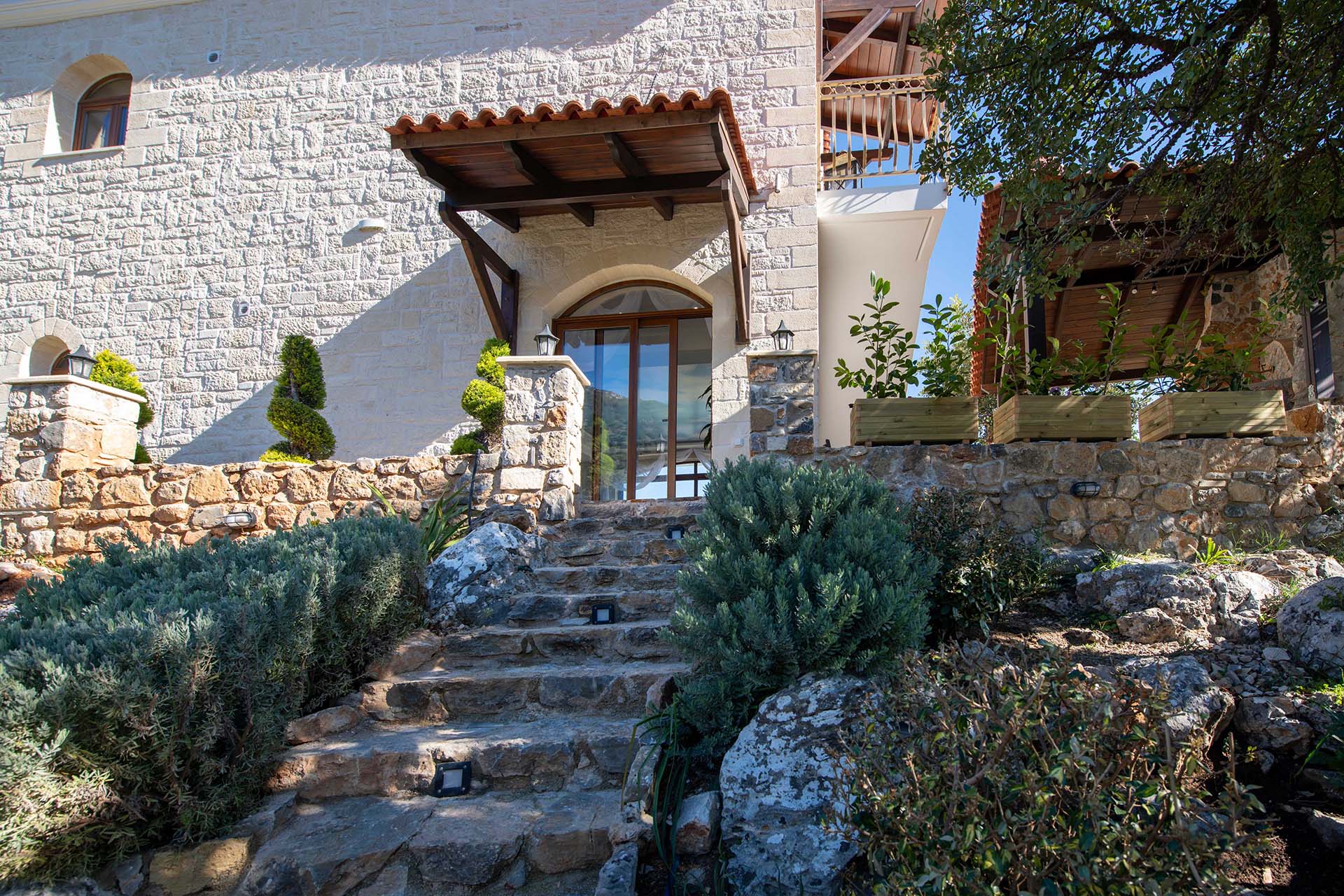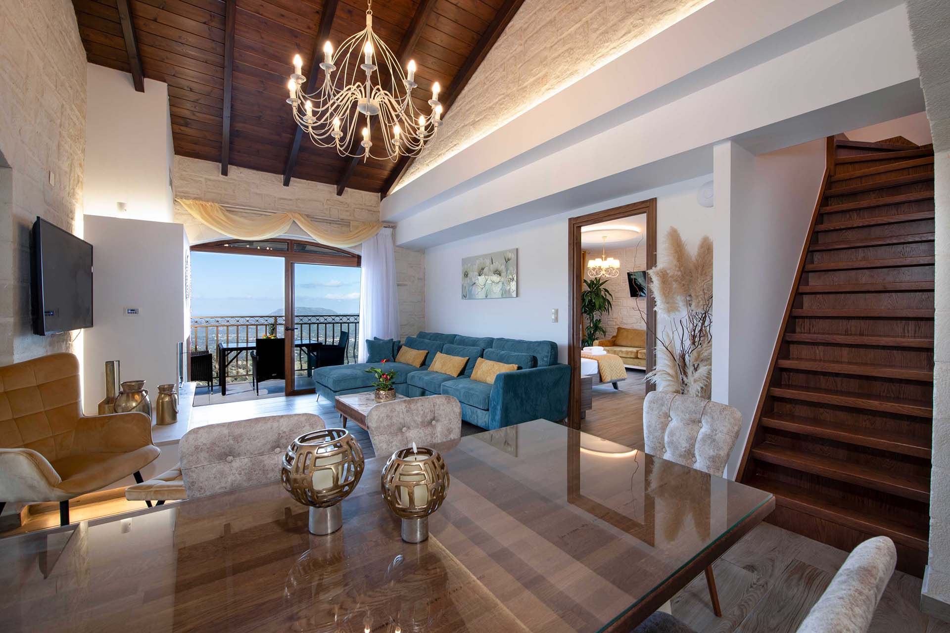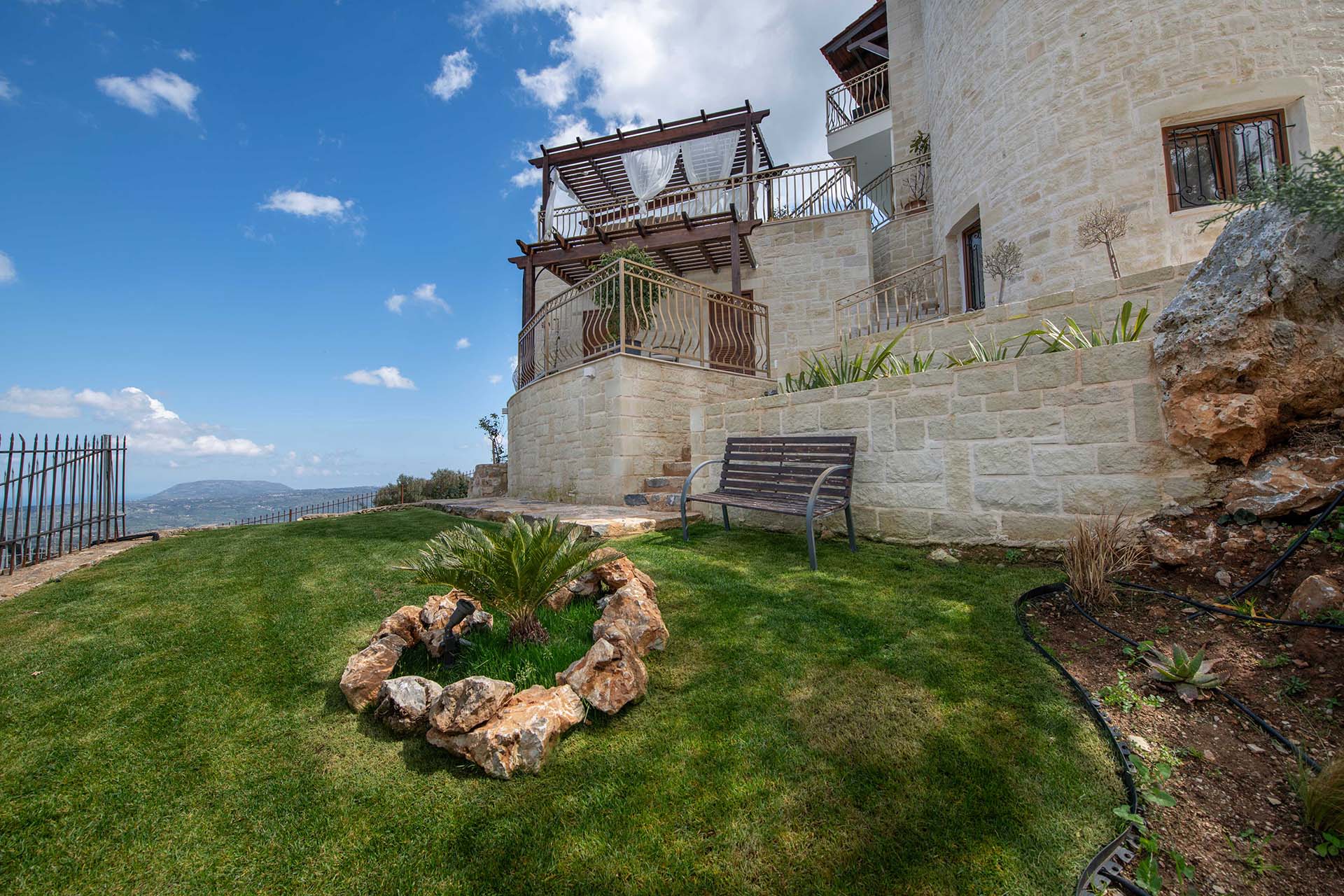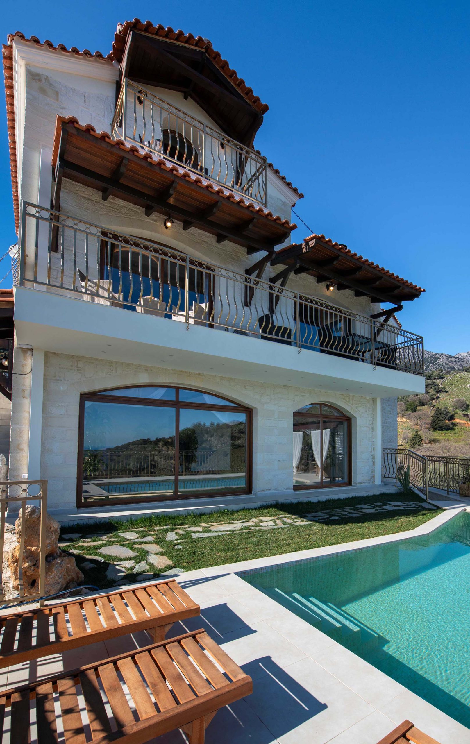 Geroulios Kastro – Deluxe Villa is located in the hills above Emprosneros, a quiet village in the Apokoronas region of Chania. The area is rural and surrounded by greenery, with very little through traffic and no nearby buildings.