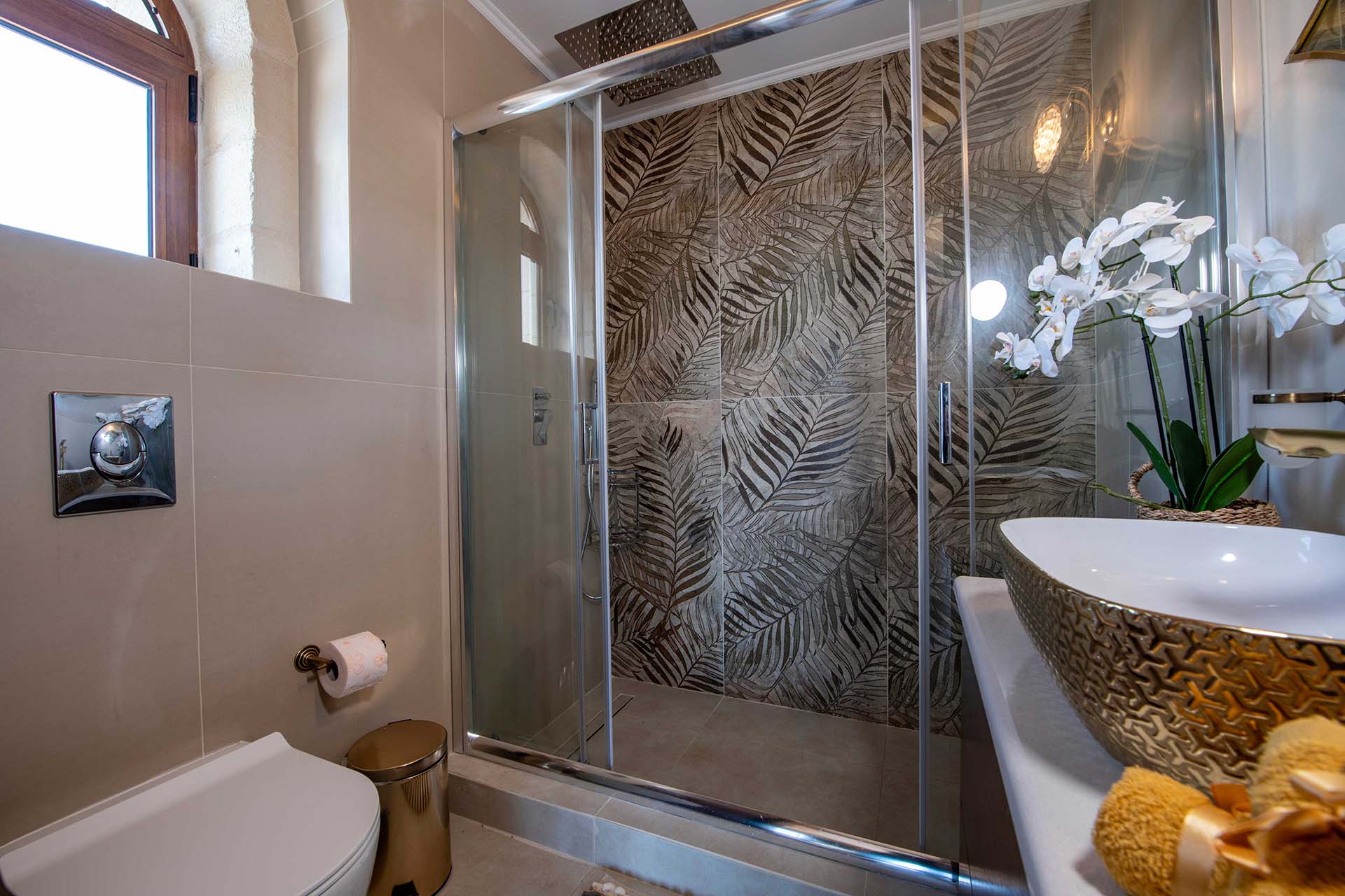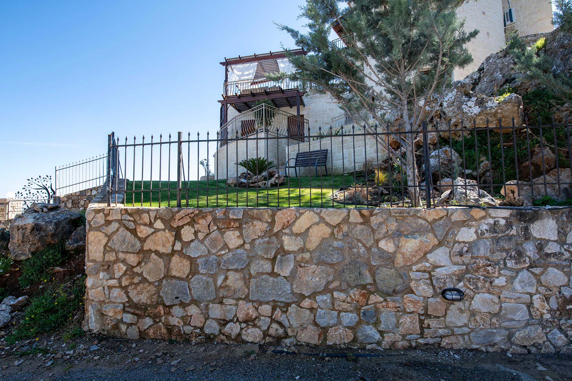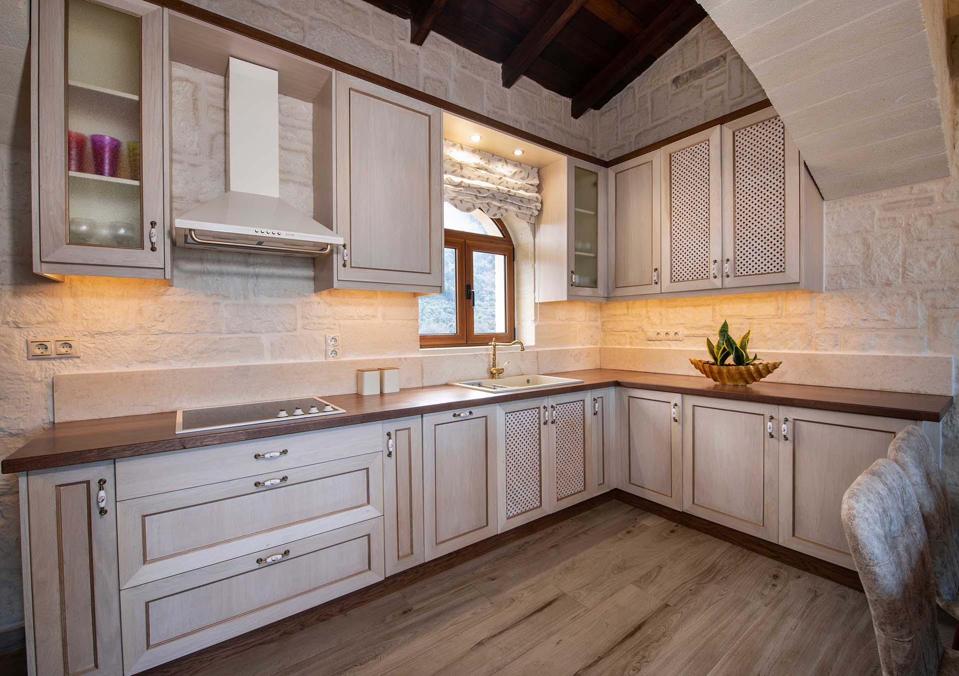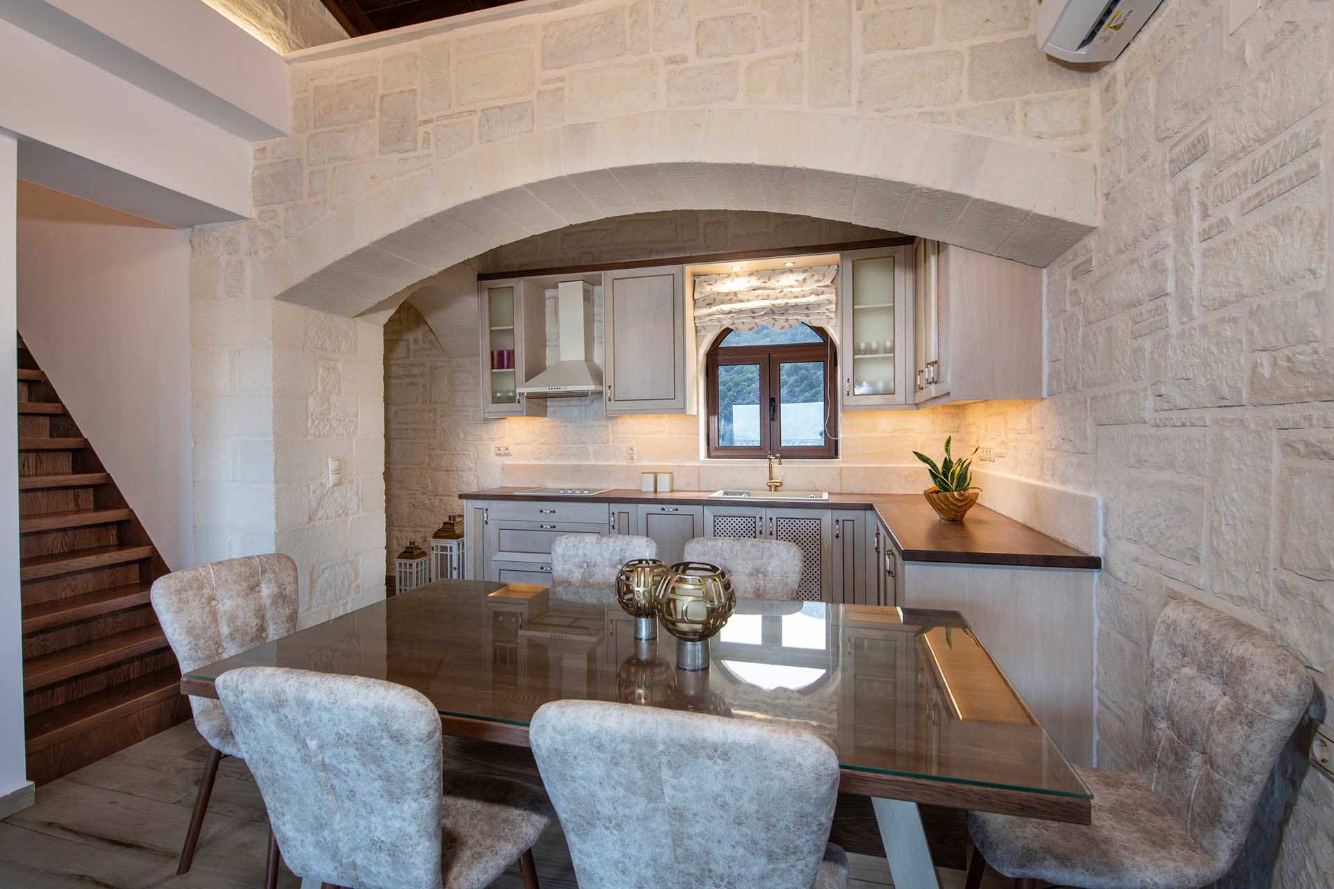 Geroulios Kastro – Deluxe Villa is located in the hills above Emprosneros, a quiet village in the Apokoronas region of Chania. The area is rural and surrounded by greenery, with very little through traffic and no nearby buildings.