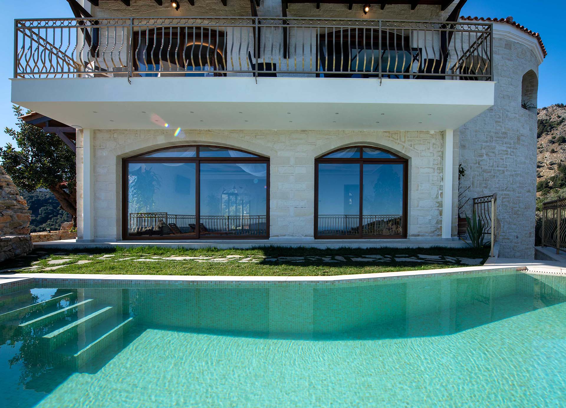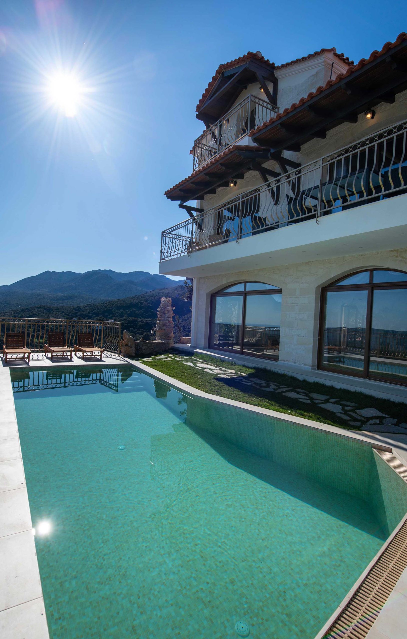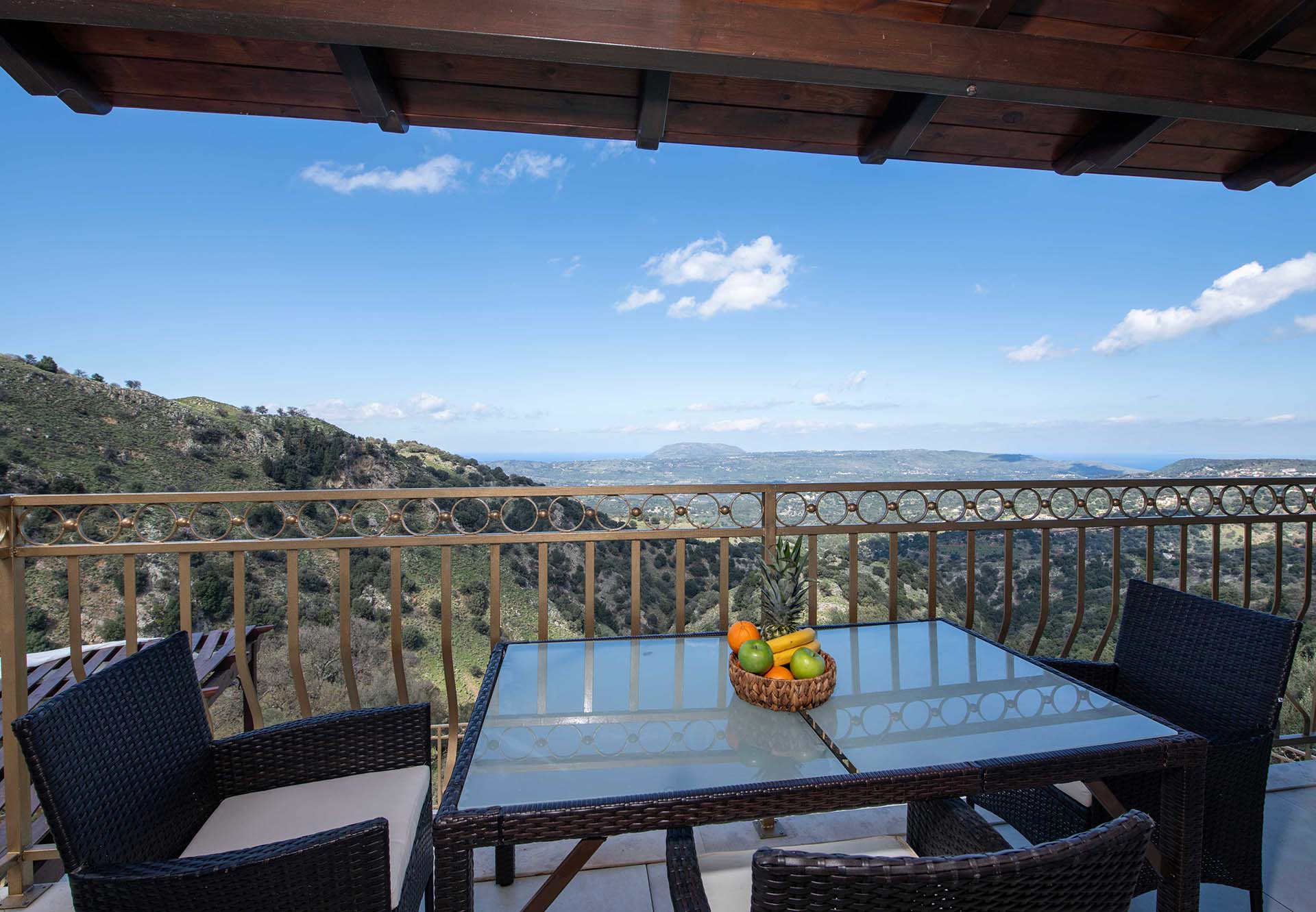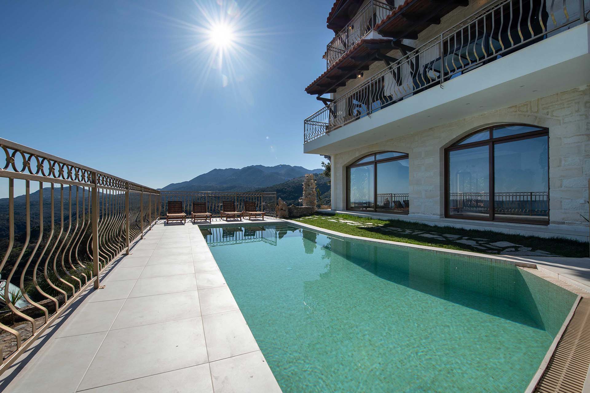 Geroulios Kastro Villa II is located above the village of Emprosneros, in the Apokoronas region of Chania, Crete. Set among greenery and accessed via a private road, the villa offers complete privacy and panoramic views in every direction.