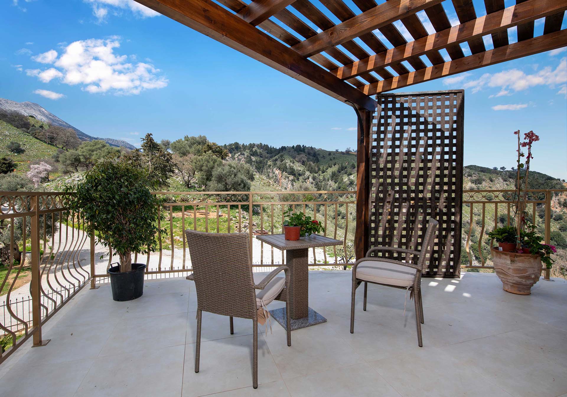 - Balcony with mountain and garden views
